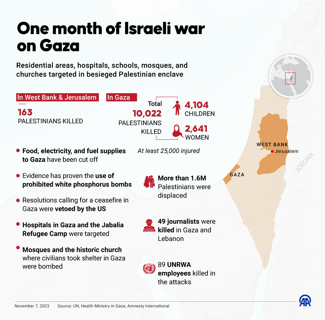 But the most shocking aspect is without a doubt the number of children casualties, which represent almost half of all casualties. In a month, Israel has killed more children in Gaza than the children killed in all the world’s conflict zones since 2019. “Gaza is becoming a graveyard for children. Hundreds of girls and boys are reportedly being killed or injured every day”, said UN Secretary-General Antonio Guterres. “Without fuel, newborn babies in incubators and patients on life support will die”. According to the head of the World Health Organization, one child killed in Gaza every 10 minutes on average. As one Washington Post article put it: “Families are mourning not just their own losses, but what feels like the loss of an entire generation”.