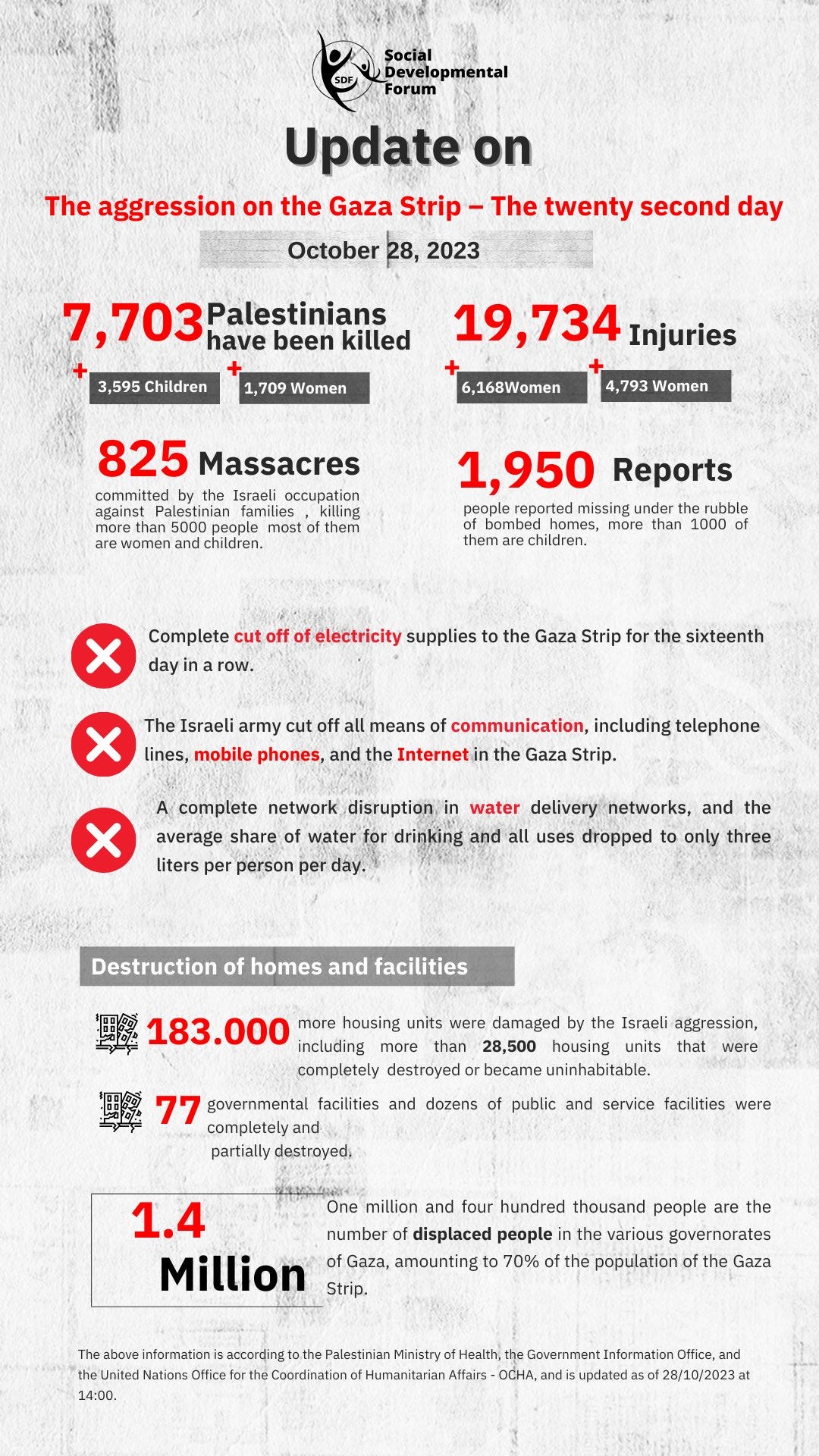 Let’s start, as always, with the death toll. According to the Health Ministry in Gaza, at least 7,000 Palestinians, including more than 3,500 children, have been killed, and almost 20,000 have been wounded, in the Israeli assault on Gaza since October 7. Here’s an infographic detailing the scale of the death and destruction: