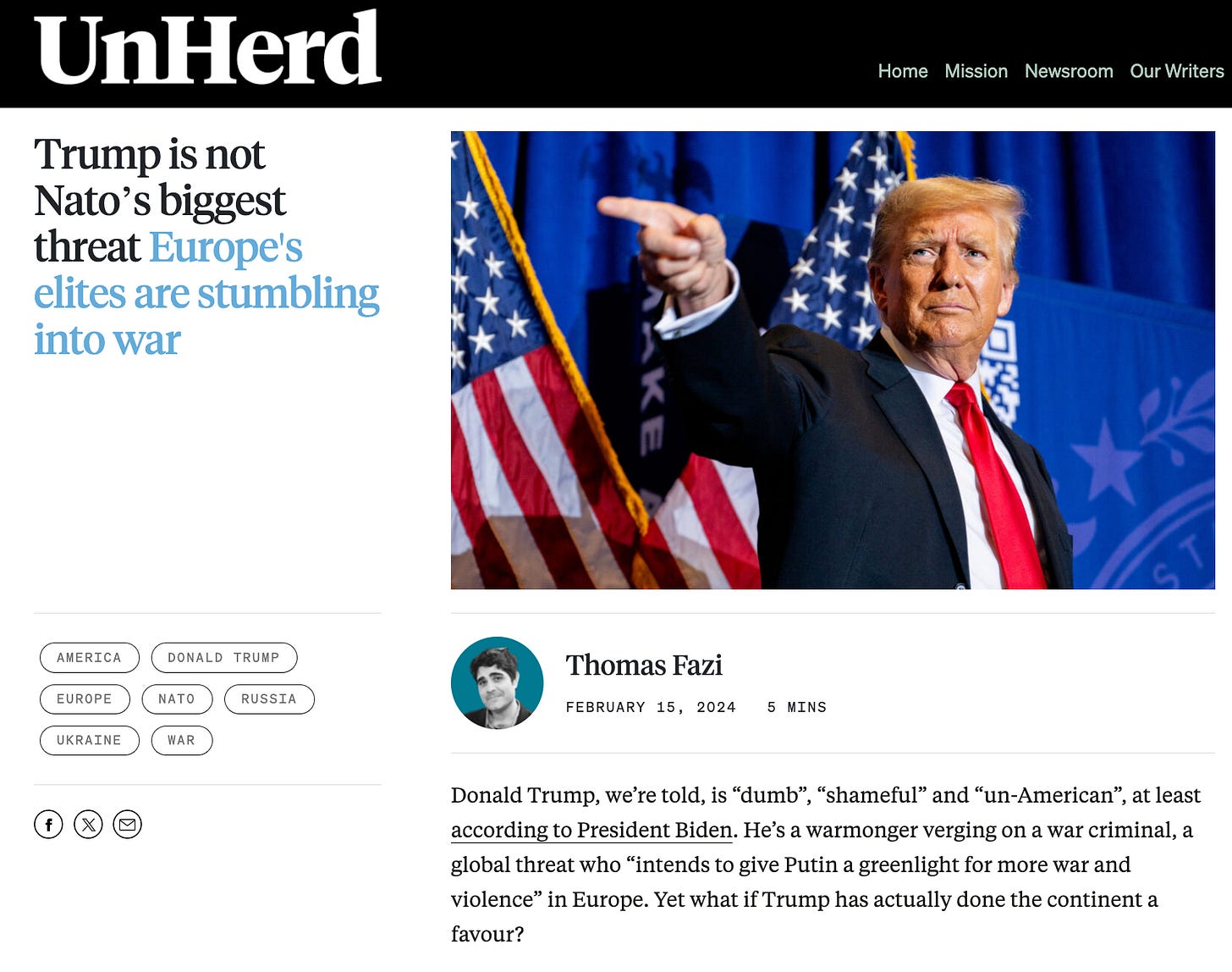 EDIT to add: The UnHerd article is very good Thomas, thanks for that. You say "I have long argued that Europe needs to free itself from the geostrategic grip of the United States.". I thought TDS and Brexit might have been a catalyst for such a welcome change. But it looks like relentless fear-mongering over the last few years has resulted in the exact opposite.